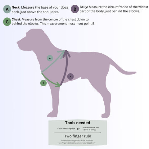 It is important to get the measurements right to assure a perfect fit. In the chart below you can find which measurements are required. Please let us know if your dog is a puppy and still growing!